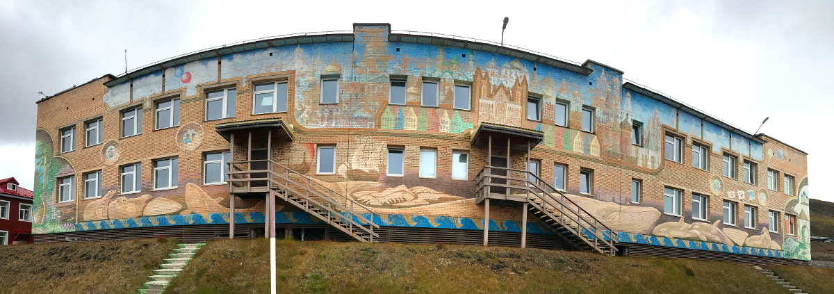 En remontant la rue principale, ne manquez pas de vous arrêter devant un long bâtiment entièrement recouvert d’une fresque mélangeant Russie, Norvège et Arctique, il s’agit de l’école de Barentsburg.