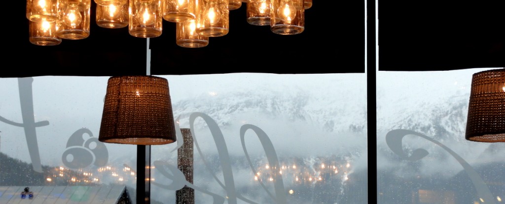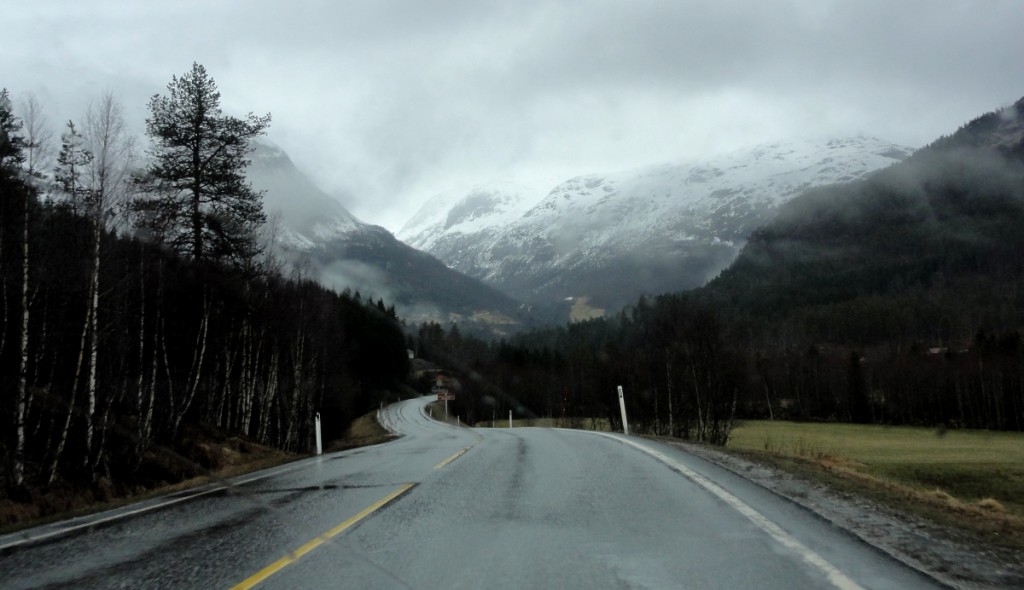 La température est remontée, pas de neige donc. Une fois de l’autre côté, nous poursuivons notre route vers la ville de Sogndal, elle se situe le long d’une des dernières ramifications du fjord. Nous ne restons pas longtemps ici, le temps y est exécrable et il n’y a pas grand chose à voir hormis le port, par contre nous faisons un stop au centre commercial pour déjeuner au chaud dans une brasserie italienne, très bonne.