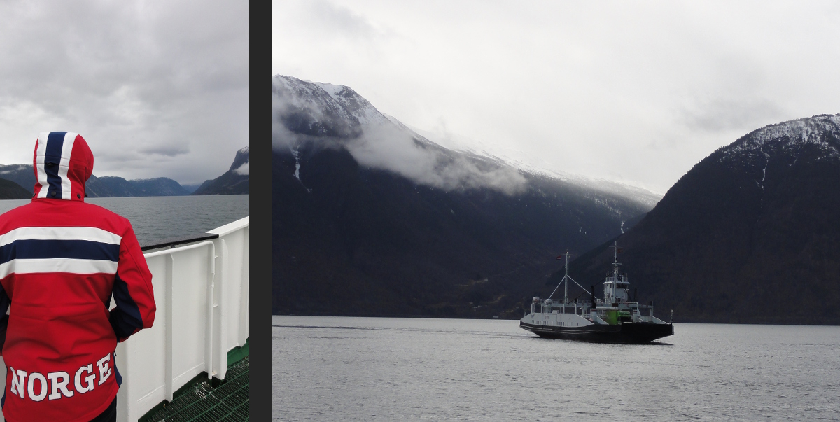 Il y a un train qui grimpe en altitude pour Myrdal d’où l’on peut voir d’énormes cascades. Mais c’est en été qu’on en profite le plus car elles doivent être encore gelées en avril. Nous choisissons l’option transport en bateau pour une petite virée sur les bras les plus spectaculaires du fjord. La voiture embarquée (nous aussi), la corne de brume sonne et c’est parti, on choisit l’option avant du bateau au froid et au vent plutôt qu’au chaud dans les cabines et banquettes !