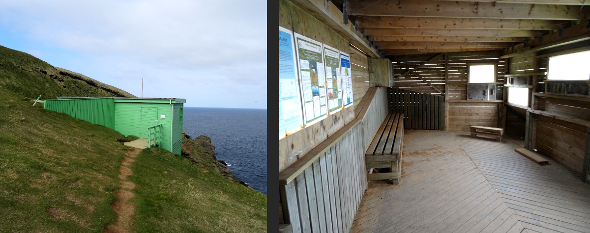 Ne cherchez pas les orques, ce ne sont que des fulmars qu’on voit sur l’eau ! En redescendant, toujours à la recherche des macareux, je vois une cabane verte. Elle est ouverte à tous pour l’observation des oiseaux. Bon, rien de rien à part des terriers vides…